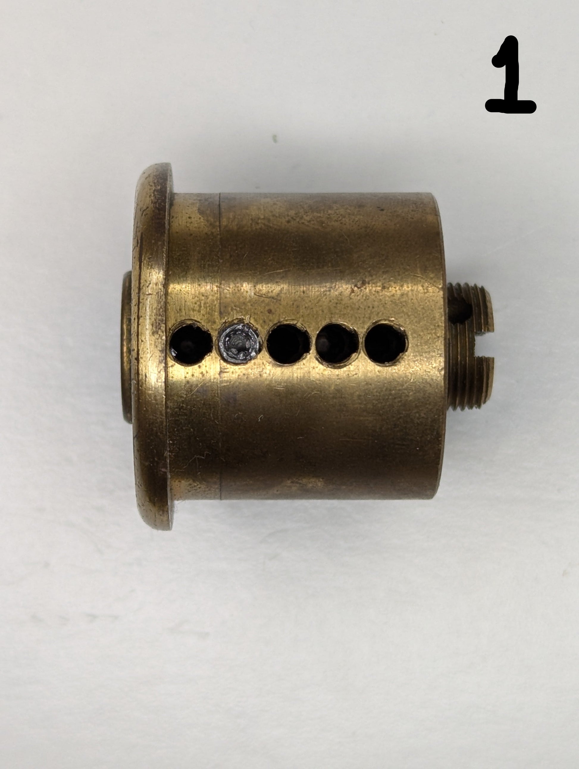 - #5: Good condition but has two stripped grub screws that have been drilled through